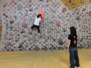 スタッフが、ジムご利用の注意事項/安全上の注意事項のご説明/準備運動/クライミングのルール説明を行ないます。その後、2~3課題を 一緒に登ります。動きやすい服と靴下のご用意だけで、ボルダリングに挑戦できます!