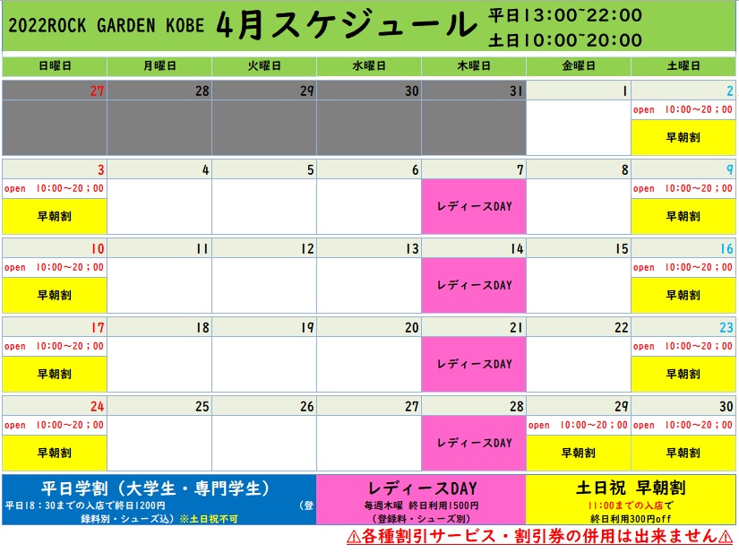 HOME > お知らせ > お知らせ4月のスケジュール 2022年3月31日 4月は休み無しで営業しますので登りに来てください^^ Twitter Share Pocket Hatena LINE コピーする -お知らせ