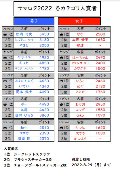 HOME > お知らせ > お知らせサマロク入賞者&抽選当選者発表! 2022年8月5日 変更をプレビュー (新しいタブで開く)各カテゴリの順位です! 入賞者にはささやかながら賞品があります✨ そして気になる抽選の結果はコチラ ↓ 74名の方に当選しました💎💎💎受け取り期限は8/29(月)までとなっております^^ 受け取りのみの来店でも構いませんのでよろしくお願いします。 Twitter Share Pocket Hatena LINE コピーする -お知らせ
