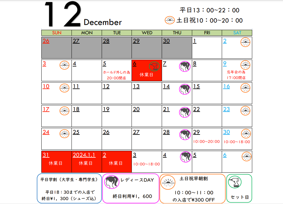 HOME > お知らせ > お知らせ12月と年末年始の営業 2023年11月27日 もう12月! 早いですね~💦 寒すぎる岩シーズンの開幕ですね、、、フリクションは良いけど寒いのは本当に嫌です🥶 雨などで外岩が中止になったらロクガまで指を鍛えに来て下さいね🔥そして12月は忘年会があったりで、営業時間の変更等があるので気を付けて下さい^^ 年末年始の営業も載せておきます! 2024年まであと少し!怪我無くクライミングを楽しみましょう👍 Twitter Share Pocket Hatena LINE コピーする -お知らせ