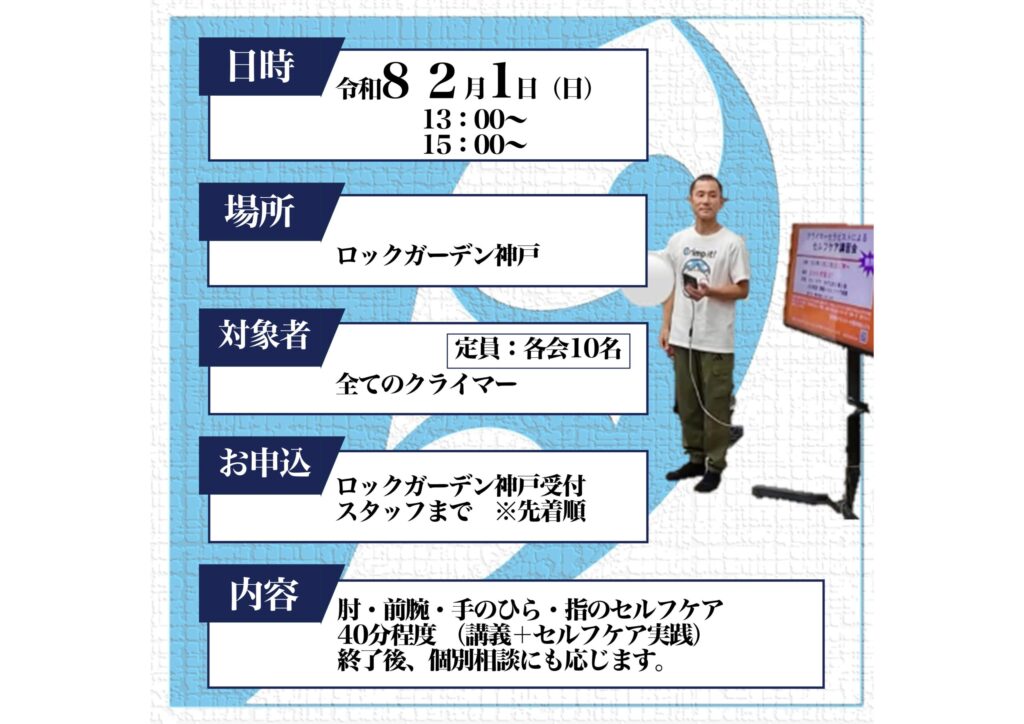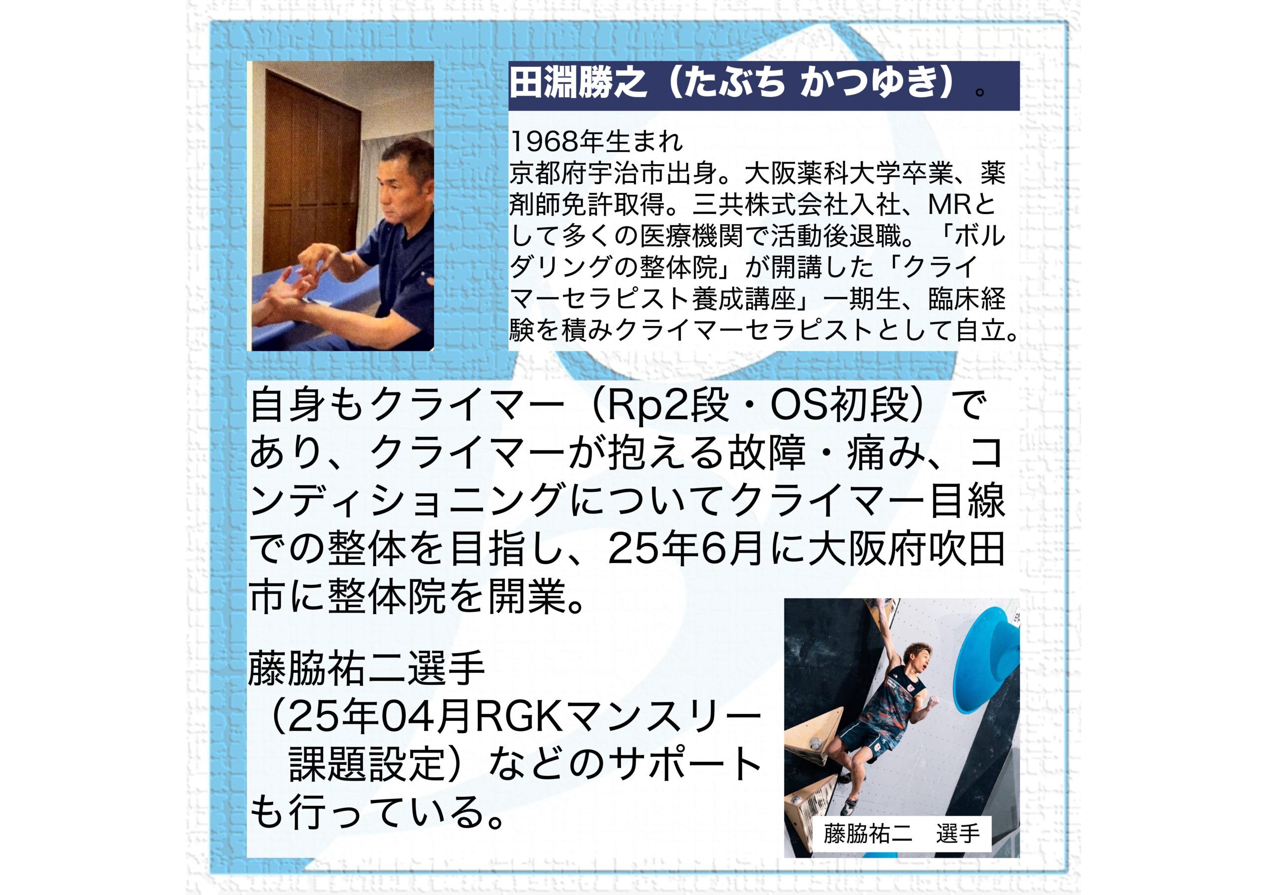 2025年6月に、大阪府吹田市で「薬剤師クライマーの整体院たぶち」を開院された、田淵勝之さんがロックガーデン神戸で、クライマーのためのセルフケア講習会を行っていただくことに