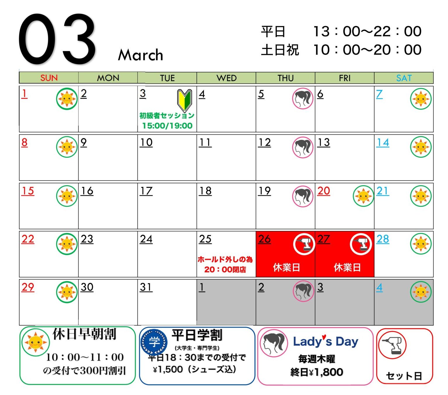HOME > お知らせ > お知らせ2026年03月スケジュールについて 2026年2月27日 2026年03月のスケジュールを発表します。日中が暖かくなって何よりです。ただ、花粉が始まりますね。鉄扉を開けて、開放感あふれるジムで皆さんをお待ちしています。 Twitter Share Pocket Hatena LINE コピーする -お知らせ