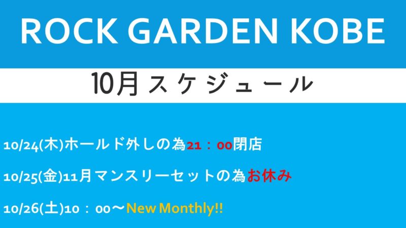 10月のスケジュールです。 10/25(金)がホールドセットの為お休みとなります。 お客様にはご迷惑をお掛けしますが、ご理解ご協力お願い致します。