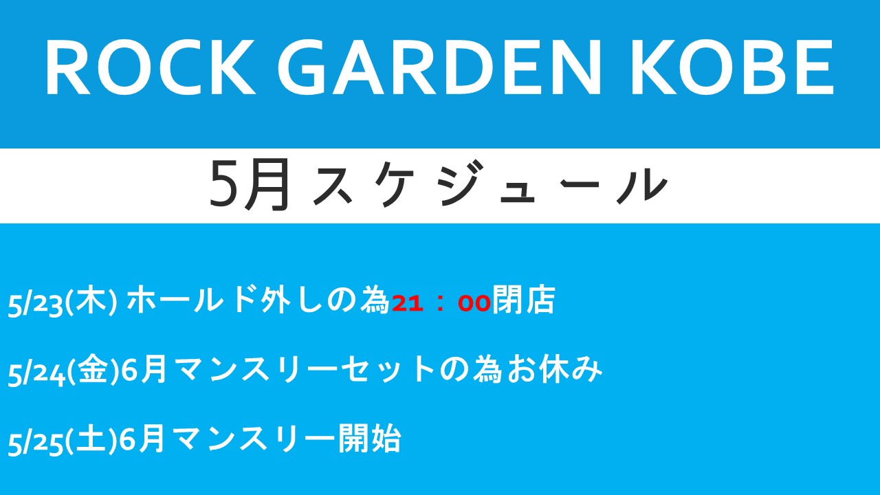 5月のスケジュールです。 5/23(木)は閉店時間が1時間早くなり、21:00閉店になります。 ご確認の上ご来店下さい。